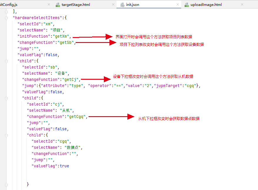 配置文件在byzt/config/init.json,配置如下,其中箭头所指向的方法名称是可以改变的,这些方法定义在:byzt/config/InitConfig.js,你们需要在这个js的方法体里面写ajax调用后台接口,获取下拉框数据。后台返回数据结构看【四、后台实现接口和前端调用接口】的序号为14到17的接口。